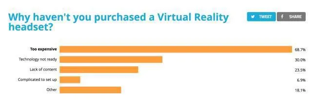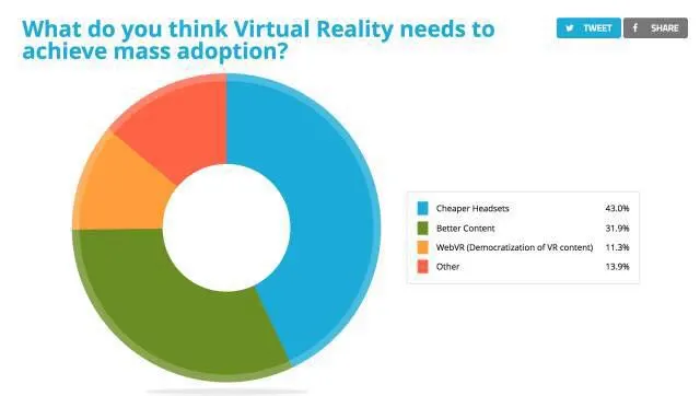 43% 的受访者认为更便宜的 VR 设备将促使 VR 大规模应用,排名第二的是“更好的VR内容”(31.9%)。