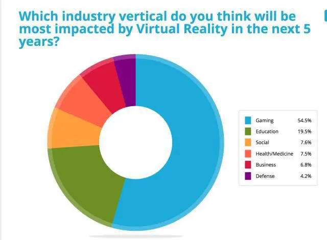 54.5% 的人认为 VR 在未来 5 年内将于游戏领域取得最大化影响,教育紧跟其后,得到了 19.5% 的选票。