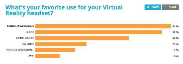 在使用目的上,用 VR 来探索环境 (61.3%)力拔头筹,其次是用 VR 来玩游戏(57.2%),往下依次还有创造内容、360° 视频和互动社交体验、建筑可视化等。