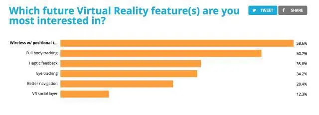58.6% 的受众认为 VR 的无线头盔最让人感兴趣,其次就是全身追踪 (50.7%) 和触觉反馈 (35.8%),其他让人感兴趣的 VR 功能还包括眼球追踪、VR 导航等。